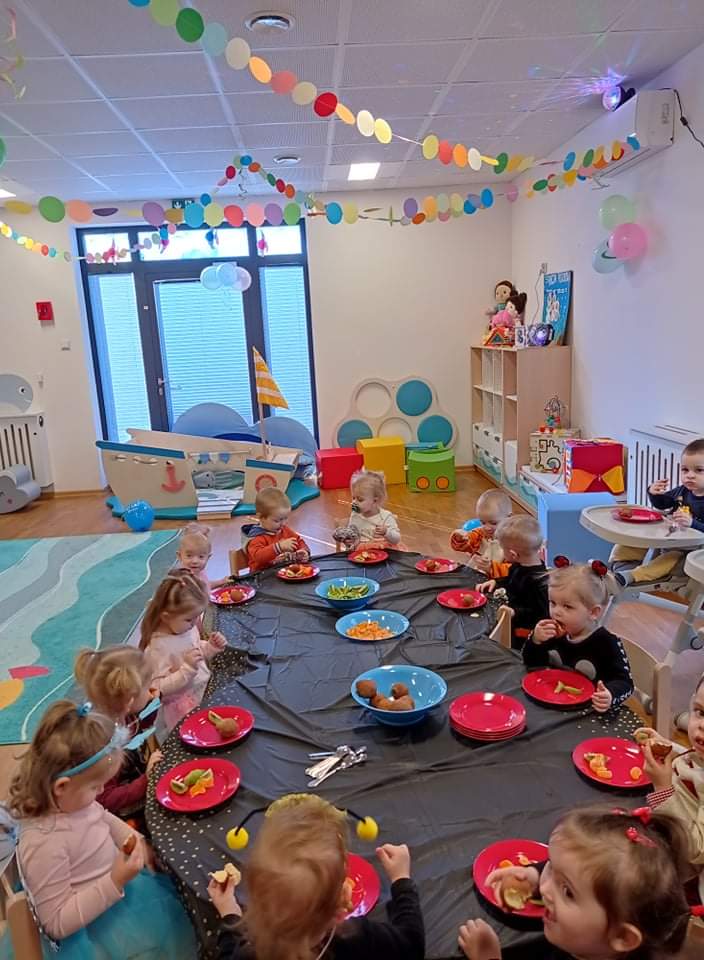 Skrzaty – najmłodsi ale niezwykle odważni wychowankowie żłobka. Dzieci uczęszczające do tej grupy zdobywają bądź doskonalą czynności lokomocyjne takie jak samodzielne wstawanie, raczkowanie, chodzenie czy bieganie. W zaskakującym tempie zdobywają kolejne umiejętności, doświadczają radości z samodzielnego picia czy prób jedzenia. Bawią i uczą się poprzez naśladowanie. Mimo, iż nie potrafią zwerbalizować swoich myśli gaworzą, pokrzykują i w sposób stanowczy zwracają na siebie uwagę.